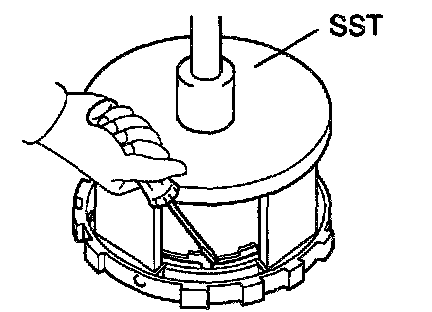 b. Place SST on the piston return spring, and compress the piston return spring with a press.