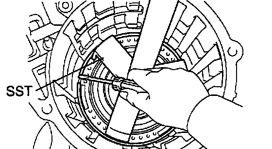 Using a dial indicator and measuring terminal Special Service Tool (SST), measure the 1st & reverse brake piston stroke while applying and releasing compressed air (392 - 785 kPa, 4 - 8 kgf/cm2, 57 - 114 psi).