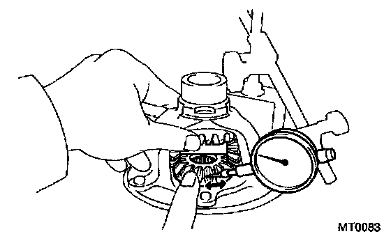 Using a dial indicator, measure the backlash of one side gear while holding one pinion toward the differential case.