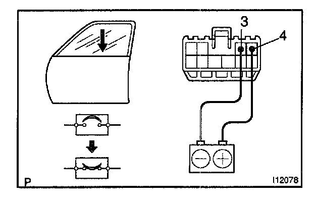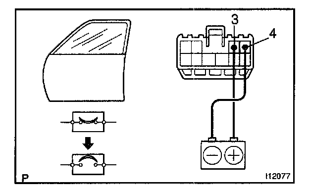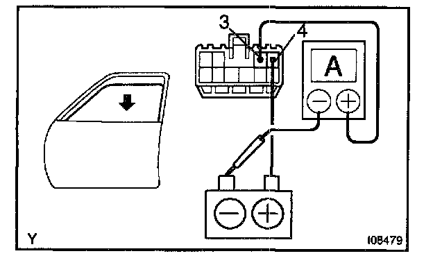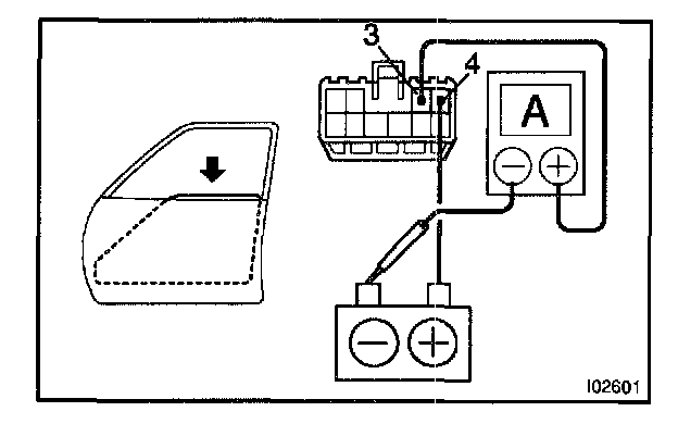 b. Connect the positive (+) lead from the battery to terminal 3 and the negative (-) lead to terminal 4 on the wire harness side connector and raise the window to full closed position.