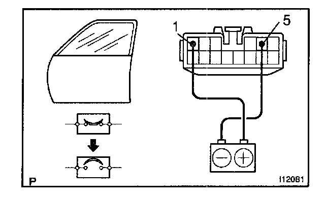 b. Connect the positive (+) lead from the battery to terminal 1 and the negative (-) lead to terminal 5 on the wire harness side connector and raise the window to full closed position.
