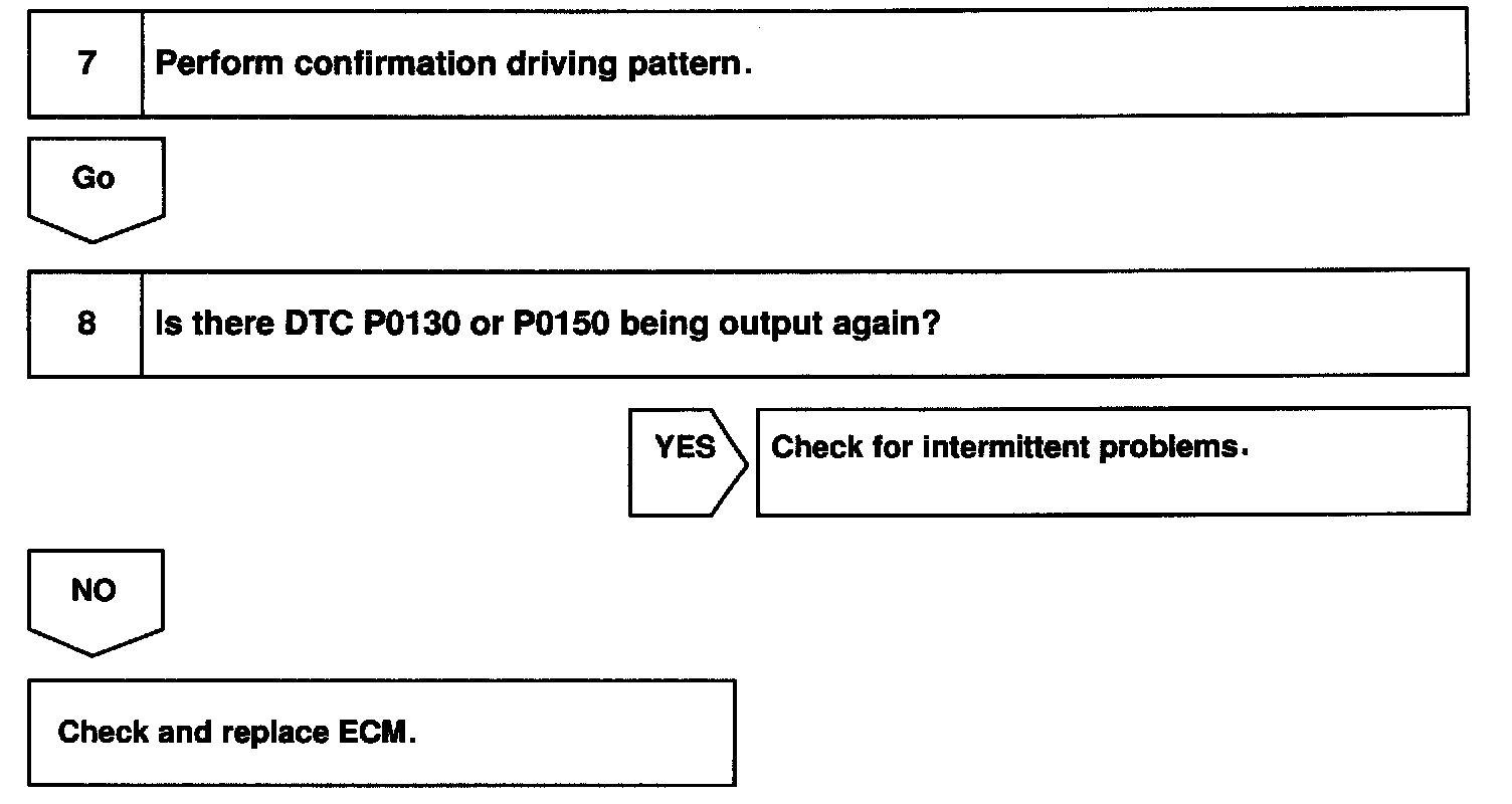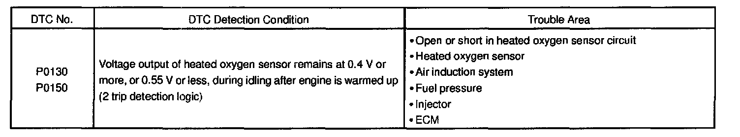 The heated oxygen sensor (bank 1, 2 sensor 1) has the characteristic and that output voltage, which changes suddenly in the vicinity of the stoichiometric air-fuel ratio. This is used to detect the oxygen concentration in the exhaust gas and provide the ECM with feedback to control the air-fuel ratio.