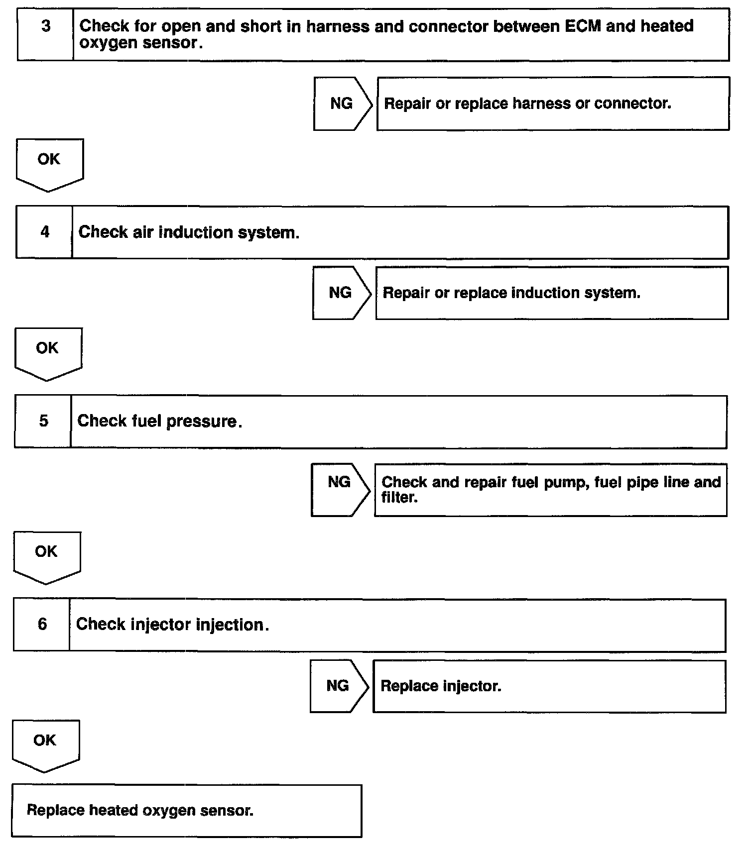 The ECM judges by the electromotive force from the heated oxygen sensor whether the air-fuel ratio is RICH or LEAN and controls the injection time accordingly. However, if malfunction of the heated oxygen sensor causes output of abnormal electromotive force, the ECM is unable to perform accurate air-fuel ratio control. The heated oxygen sensors include a heater which heats the zirconia element. The heater is controlled by the ECM. When the intake air volume is low (the temperature of the exhaust gas is low) current flows to the heater to heat the sensor for accurate oxygen concentration detection.