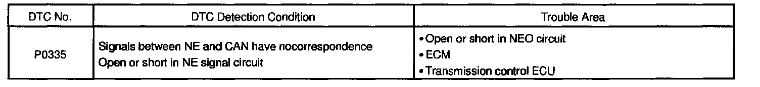 The transmission control ECU receives engine speed from the NE circuit. If open or short is detected in the NEO circuit, the transmission control ECU judges the circuit is in malfunction and records DTC P0335 in the transmission control ECU.