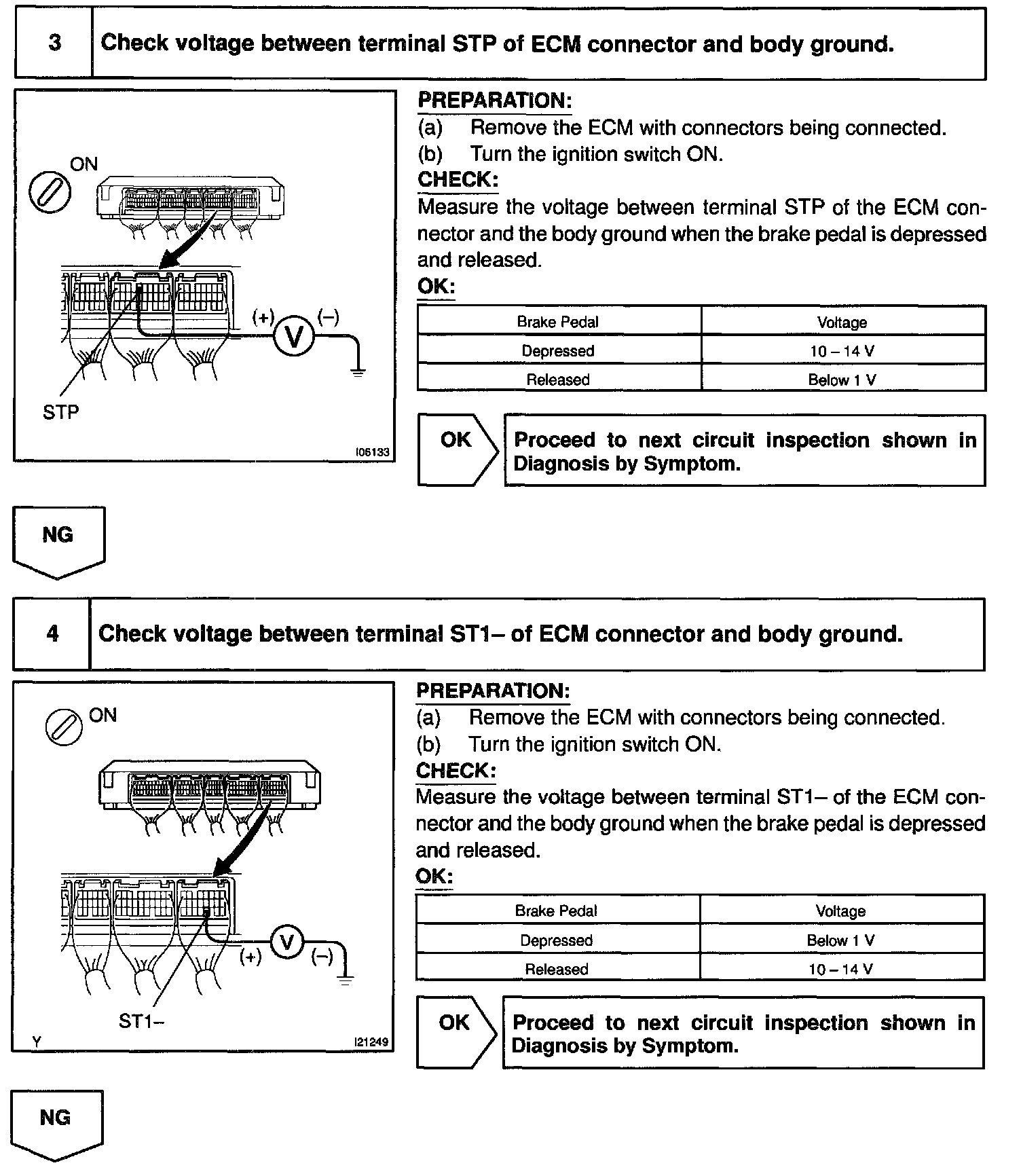 When the brake is on, battery positive voltage is normally applied through the STOP fuse and stop light switch to terminal STP of the ECM, and the ECM turns the cruise control off.