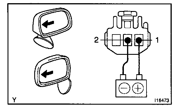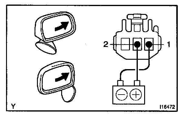 INSPECT MIRROR MOTOR OPERATIONa. Connect the positive (+) lead from the battery to terminal 2 and the negative (-) lead to terminal 1, and check that the mirror turns to the right.
