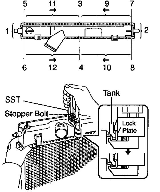 a. Lightly press SST against the lock plate in the order shown in the illustration. After repeating this a few times, fully caulk the lock plate by squeezing the handle until stopped by the stopped plate.