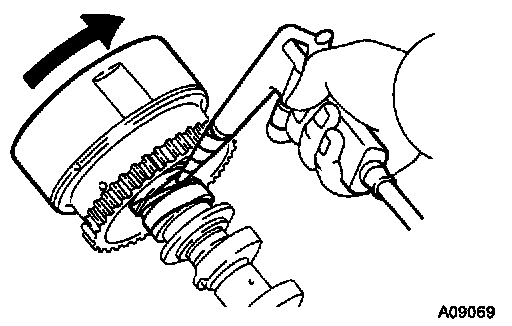 e. Under the condition of (d), turn the VVT timing sprocket to the advance angel side (the arrow marked direction in the illustration) with your hand.