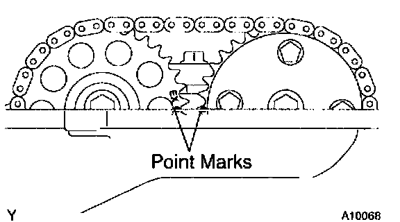 b. Check that the point marks of the camshaft timing sprocket and VVT timing sprocket are in straight line on the timing chain cover surface as shown in the illustration.
