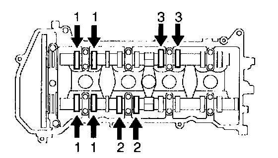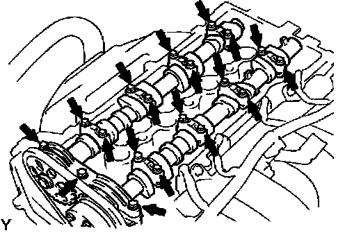 1) Remove the 19 bolts and 9 camshaft bearing caps.