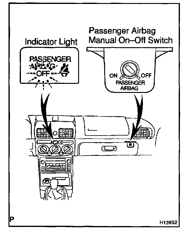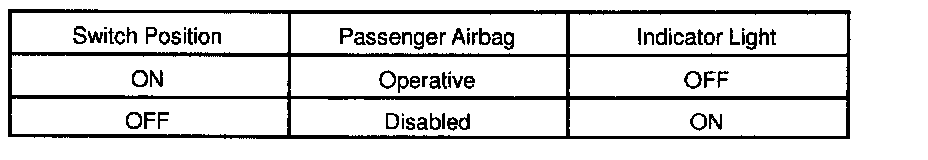 Passenger airbag manual on-off switch is mounted on in the glove compartment door. By turning the passenger airbag manual on-off switch to OFF with the ignition key, the passenger airbag system can be disabled. Also, in order to notify the passenger that the passenger airbag is disabled, OFF indicator inside the switch will light up.
