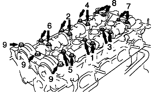 After tightening the No. 1 camshaft bearing cap, tighten in several passes, in the sequence shown.