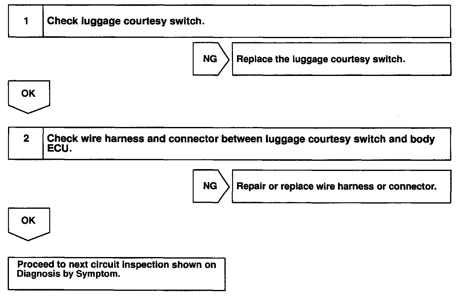 The luggage courtesy switch goes on when luggage compartment door is opened and goes off when luggage compartment door is closed.