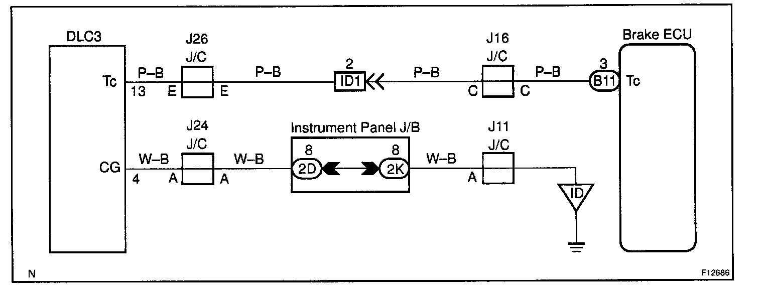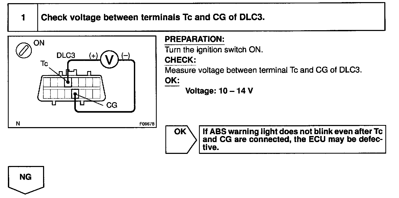 Connecting terminals Tc and CG of the DLC3 causes the ECU to display the DTC by flashing the ABS warning light.