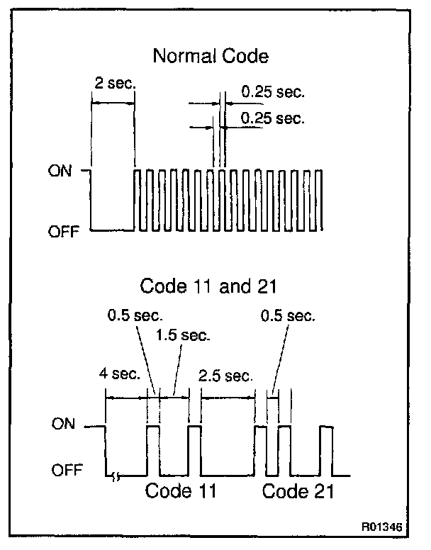- As an example, the blinking patterns for normal code and codes 11 and 21 are shown on the left.
