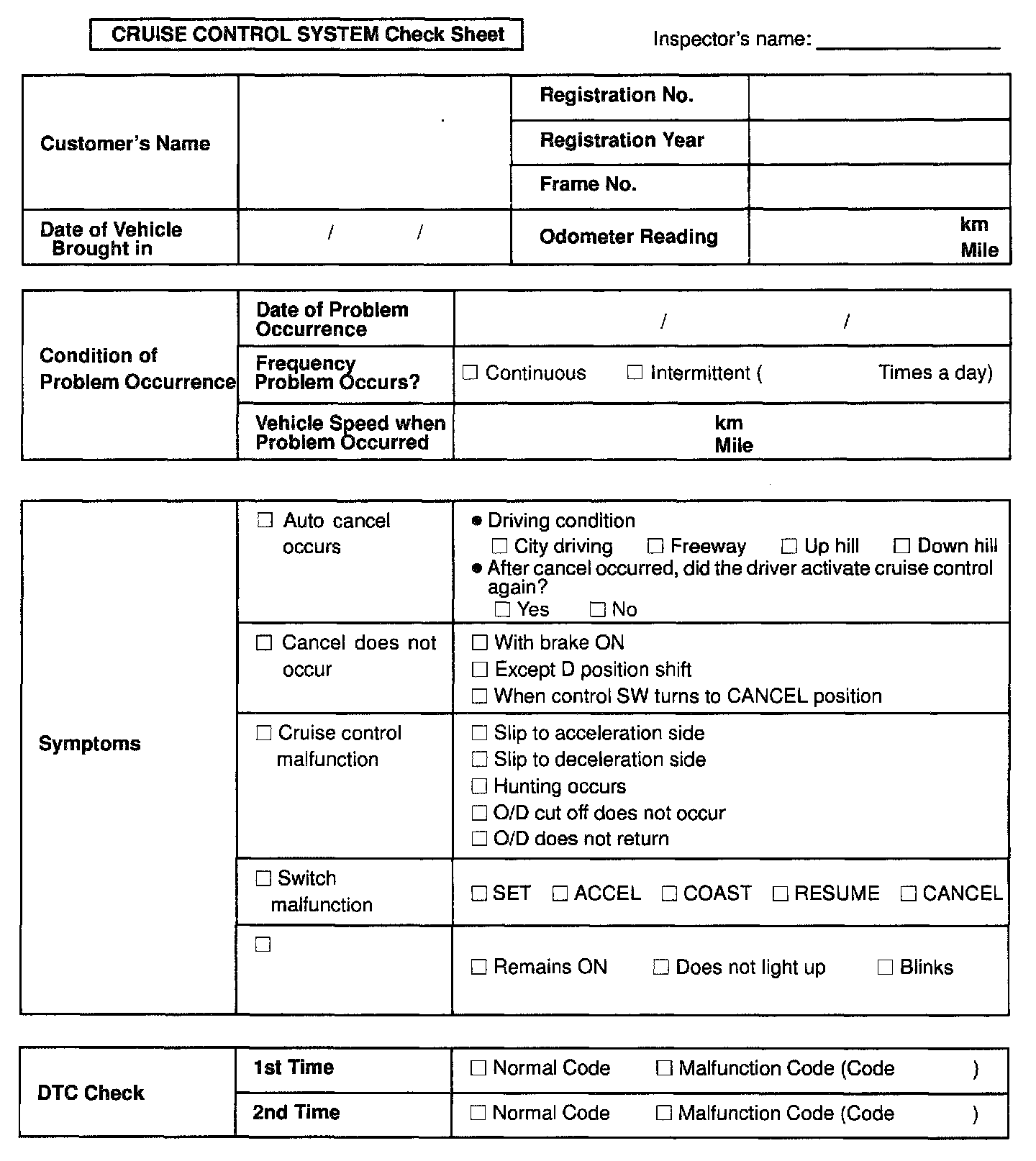 Cruise Control System Check Sheet:
