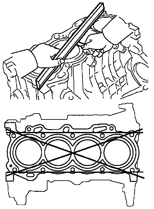 Using a precision straight edge and feeler gauge, measure the surface contacting the cylinder head gasket for warpage.