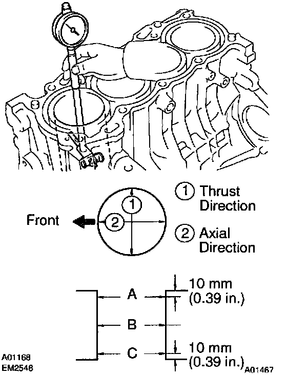 b. Measure the cylinder bore diameter in the thrust directions. (See procedure in step 5)