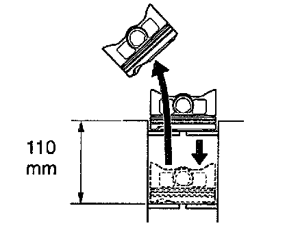 b. Using a piston, push the piston ring a little beyond the bottom of the ring travel, 110 mm (4.33 inch) from the top of the cylinder block.