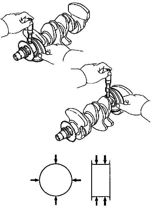 b. Check each main journal and crank pin for taper and out-of-round as shown.