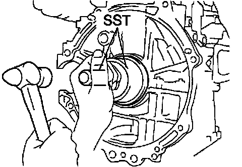 d. Using SST and a hammer, tap in the oil seal until its surface is flush with the rear oil seal retainer edge.