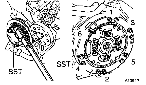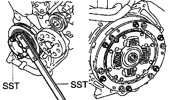 Using SST, hold the crankshaft pulley, remove the 6 bolts and flywheel.