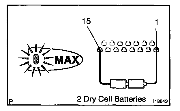 Connect the positive (+) lead from the two 1.5 V dry cell batteries to terminal 1 and negative (-) lead to terminal 15, then check that the MAX. A/C indicator lights up.