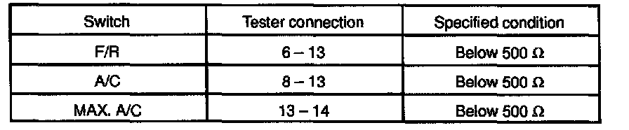c. Connect the positive (+) lead from the tester to terminal 10 and negative (-) lead to terminal 13 then check that the voltage at each dial position, as shown in the chart.