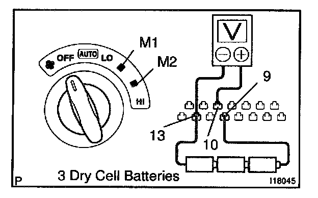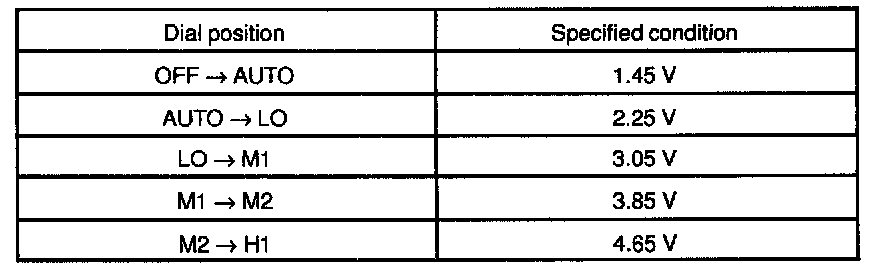c. Connect the positive (+) lead from the tester to terminal 12 and negative (-) lead to terminal 13, then check that the voltage at each dial position, as shown in the chart.