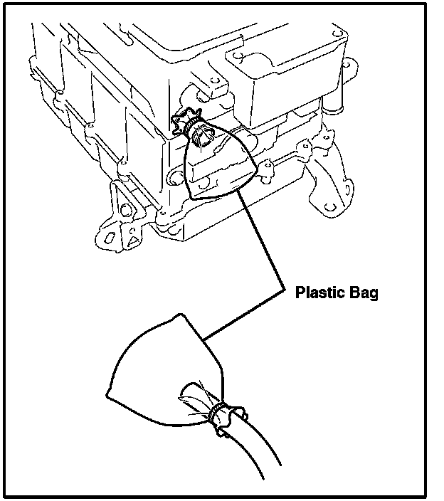 5. Due to its internal structure, some coolant will remain in the inverter after draining the cooling system. Before removing it from the vehicle, cover the inverter fittings AND rubber hoses to prevent any coolant from spilling out. If a suitable cap/plug is not available, use a plastic bag or the finger of a latex glove as shown.