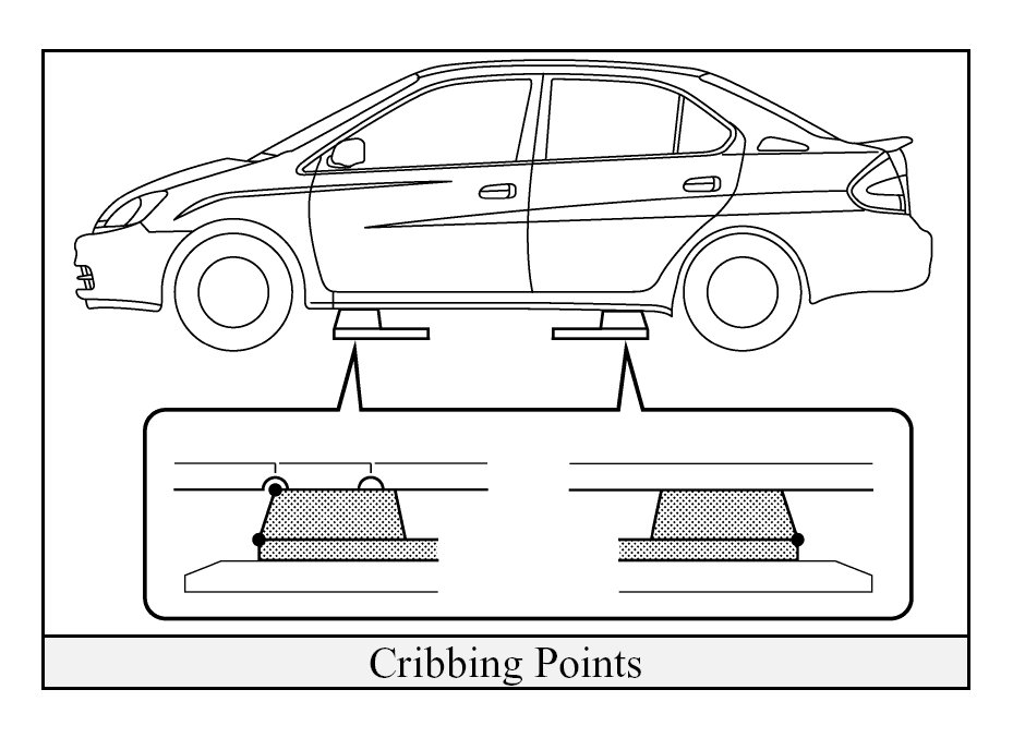 - Crib at (4) points directly under the front and rear pillars. Do not place cribbing under the high voltage power cables, exhaust system, or fuel tank.