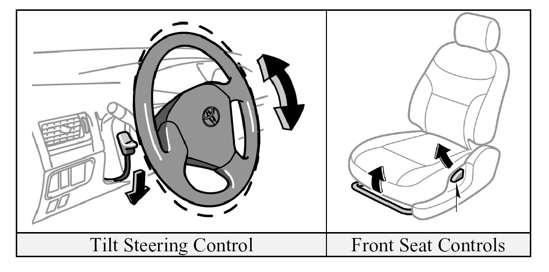 Tilt steering and seat controls are shown in the illustration.
