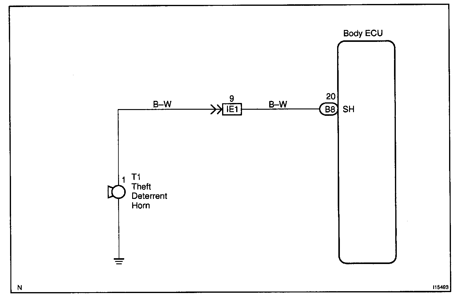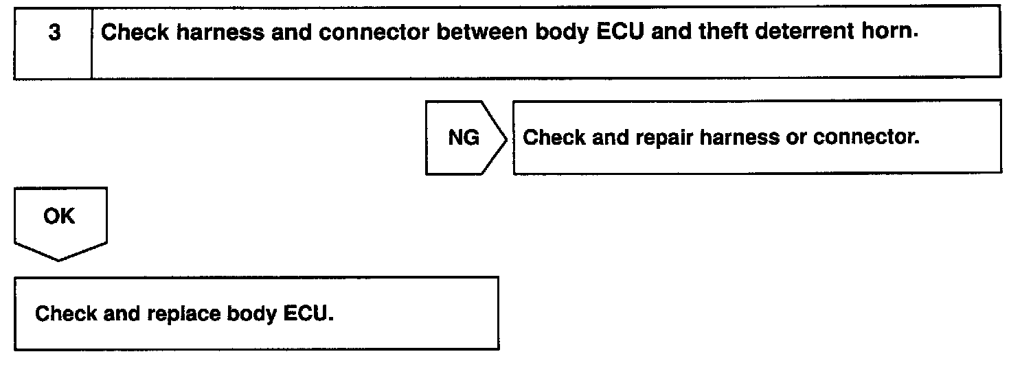 CIRCUIT DESCRIPTIONWhen the theft deterrent system is activated, the relay in the ECU turns ON and OFF cycles of approximately 0.2 sec., causing the theft deterrent horn to blow (See the wiring diagram below).