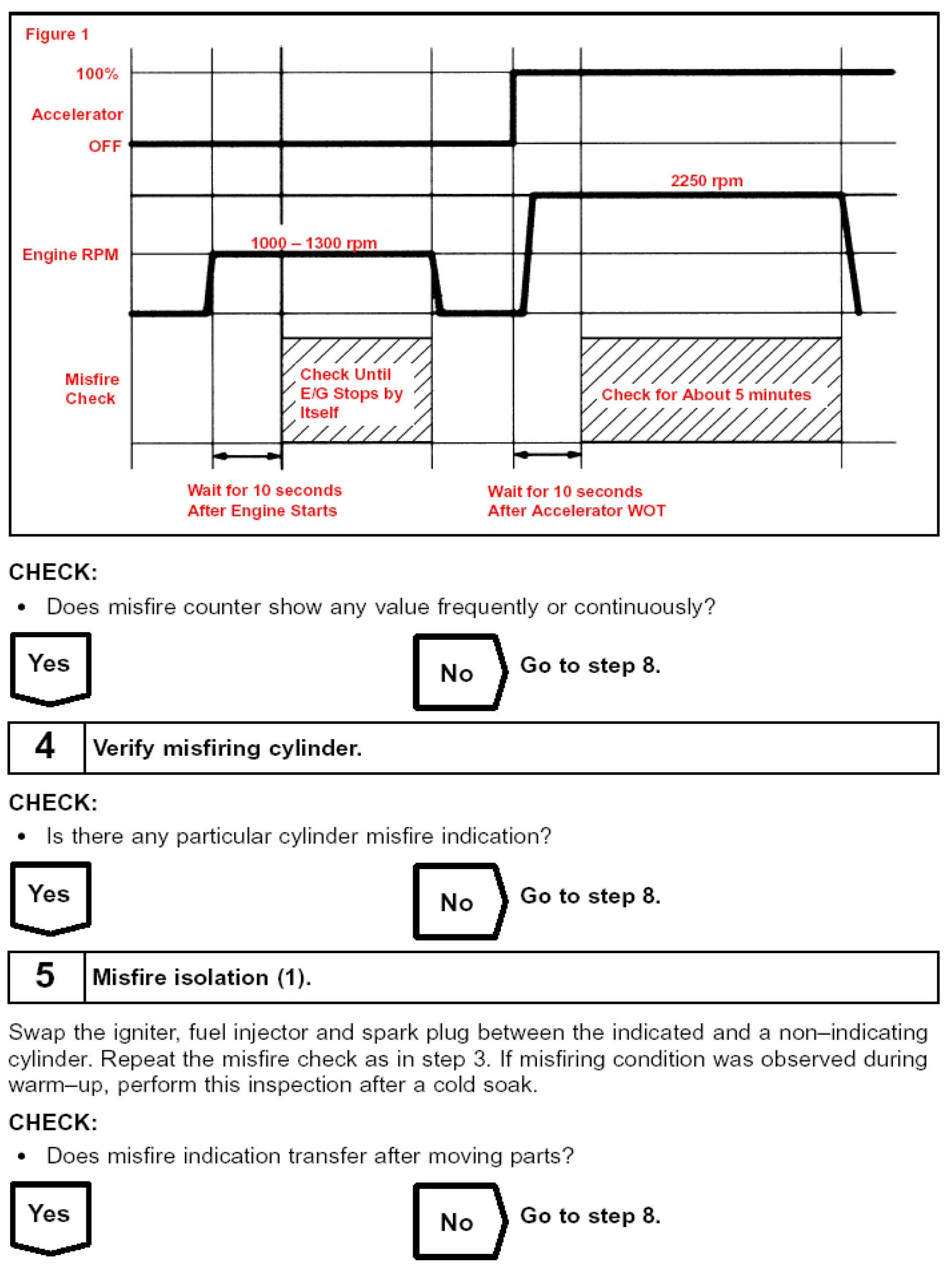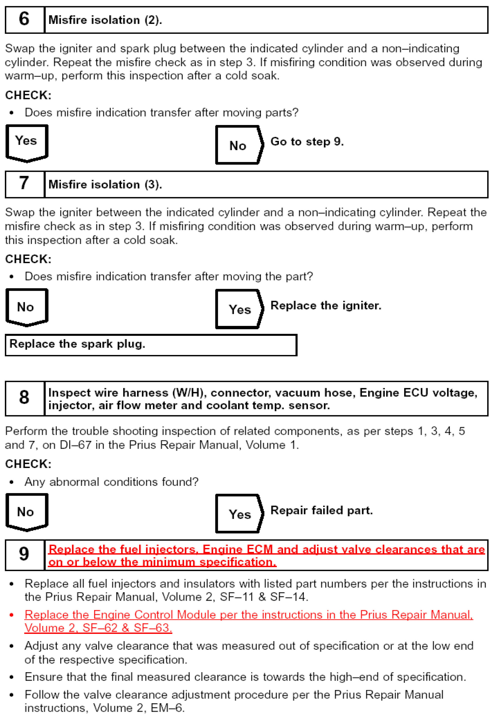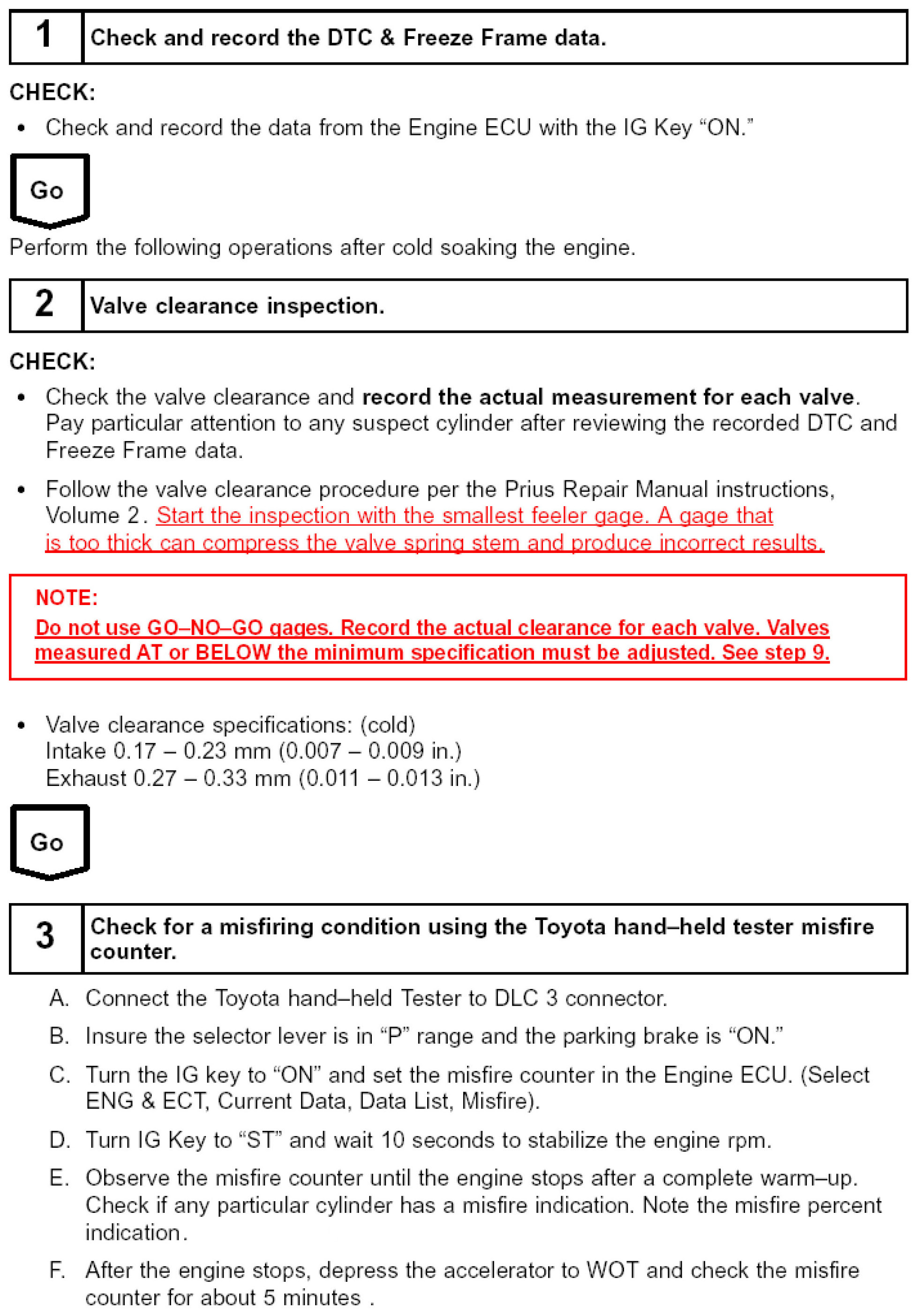 Some 2001 model year Prius vehicles may exhibit a M.I.L. "ON" condition with Diagnostic Trouble Codes P0300, P0301, P0302, P0303, P0304 stored in the Engine ECU. Use the following procedure to diagnose and correct this condition.