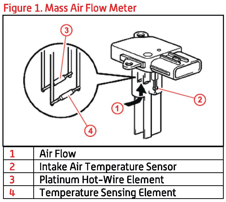 Check for debris lodged in the Mass Air Flow (MAF) meter. To diagnose this condition, you MUST REMOVE the MAF and inspect the 2 sensing elements inside the cavity. Clean with compressed air even if nothing is visibly contaminating the sensor. Debris may be trapped in the cavity even though it cannot be seen (Figure 1).