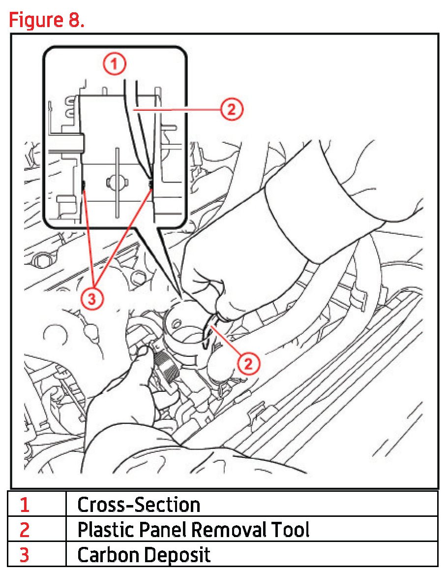 C. If necessary, use a plastic panel removal tool to remove any carbon deposits that could not be removed by wiping.