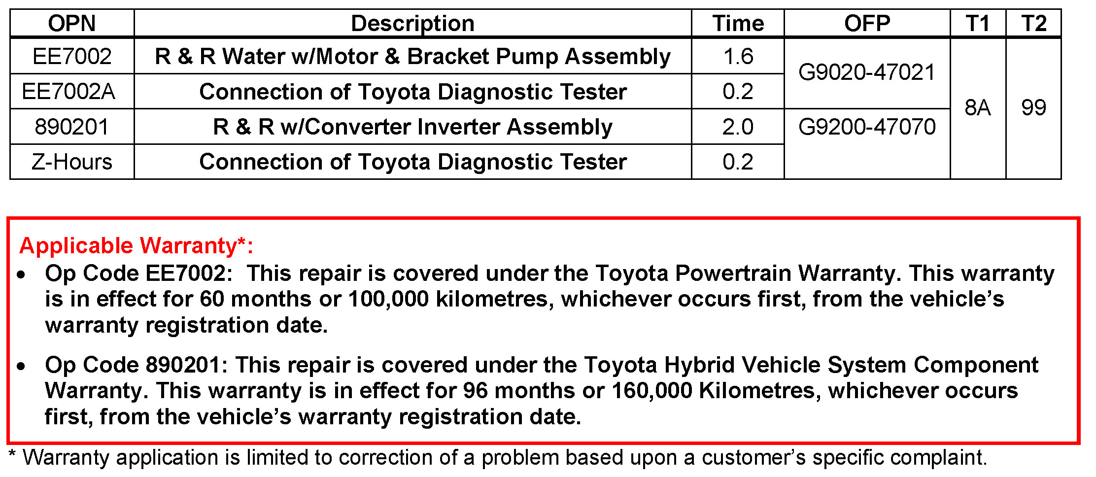 - Condition A: DTC detection from a reduction in HV cooling system performance due to reduced or no water flow from the water pump. The HV Water Pump Assembly has been improved to correct this condition.