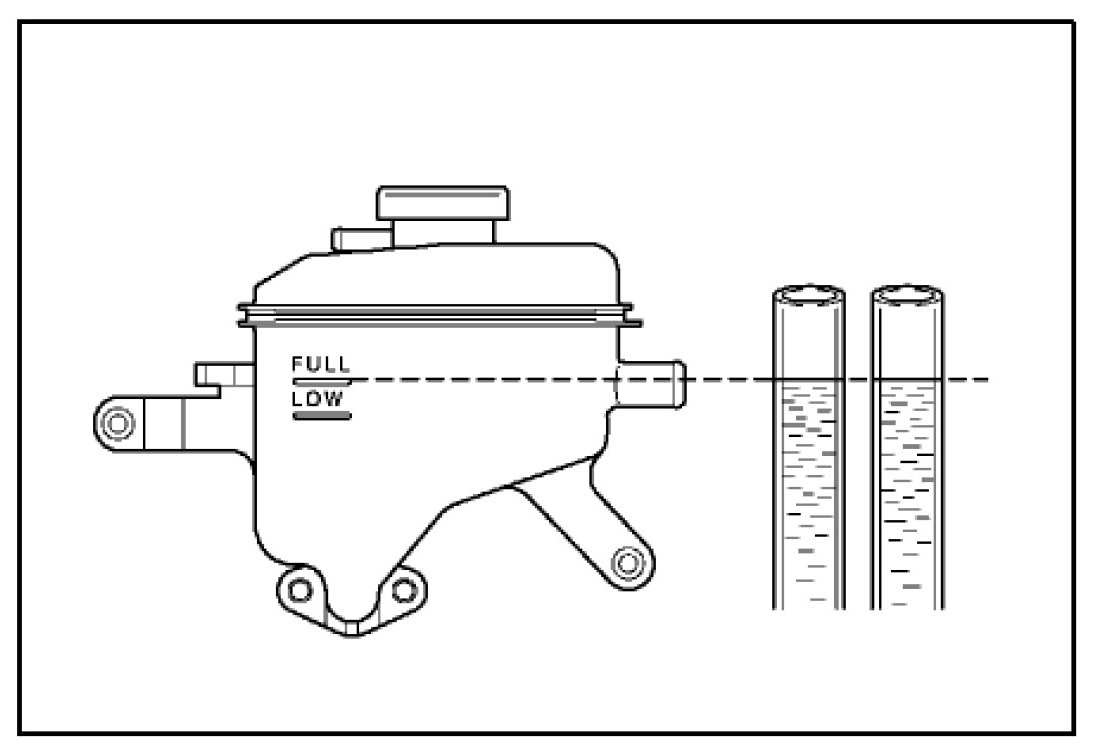 B. Fill the reservoir until the coolant level in the hose connected to the bleeder plugs reaches the same level as the FULL mark on the reservoir tank as shown in the illustration.