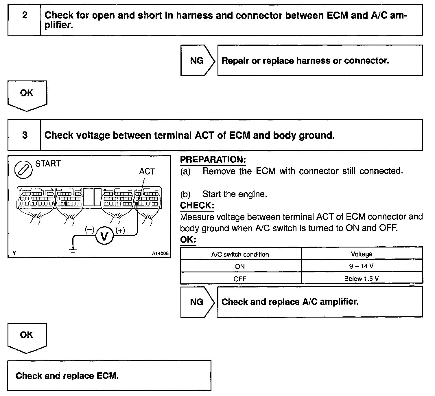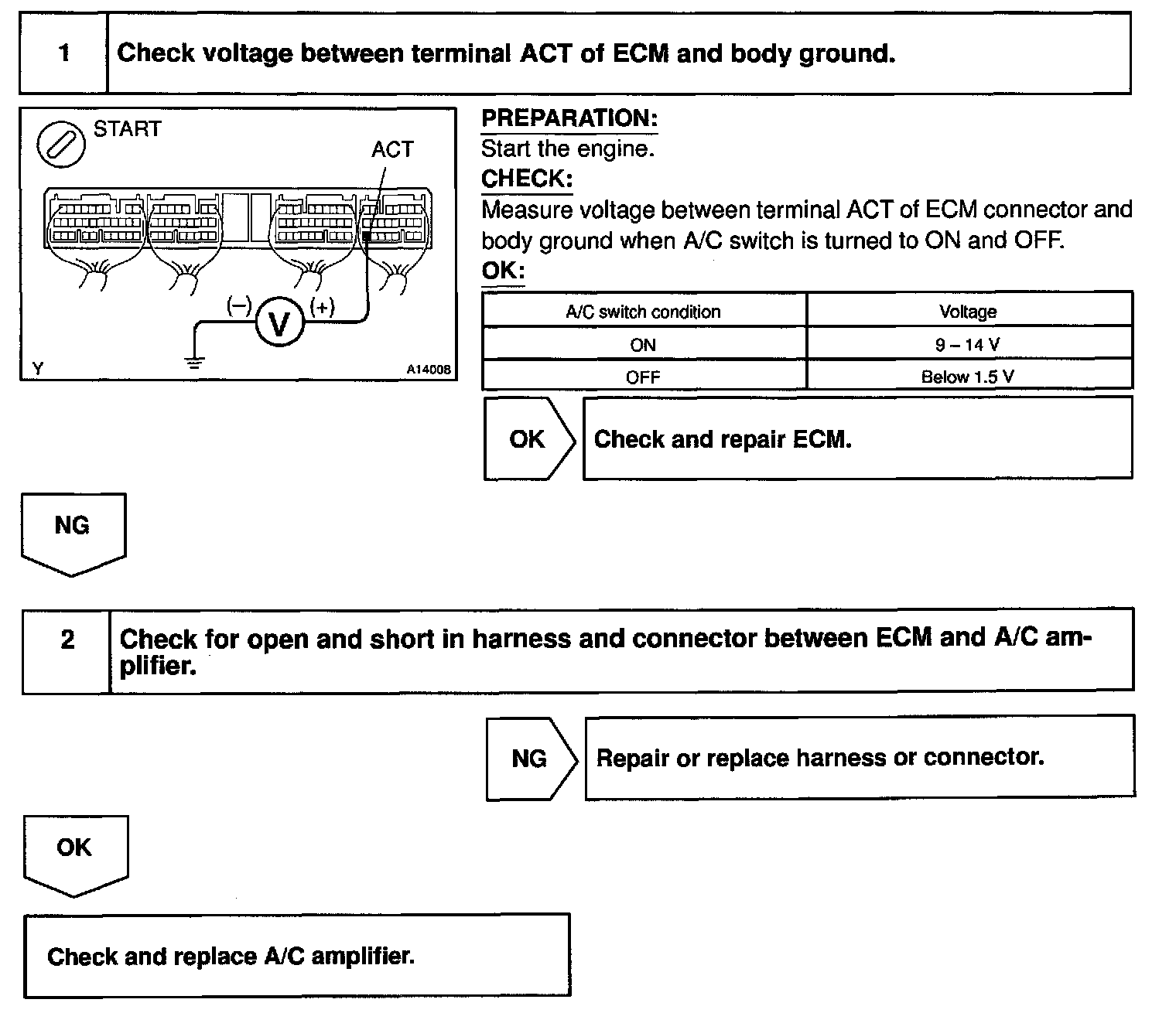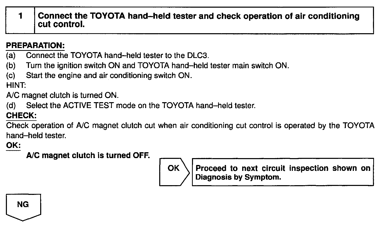 CIRCUIT DESCRIPTIONThis circuit cuts air conditioning operation during vehicle acceleration in order to increase acceleration performance. During acceleration with the vehicle speed at (AT: 25 km/h (16 mph), MT: 40 km/h (25 mph)) or less, engine speed at (AT: 1,200 rpm, MT: 1,600 rpm) or less and throttle valve opening angle at 60 ° or more, the A/C magnet switch is turned OFF for several seconds.