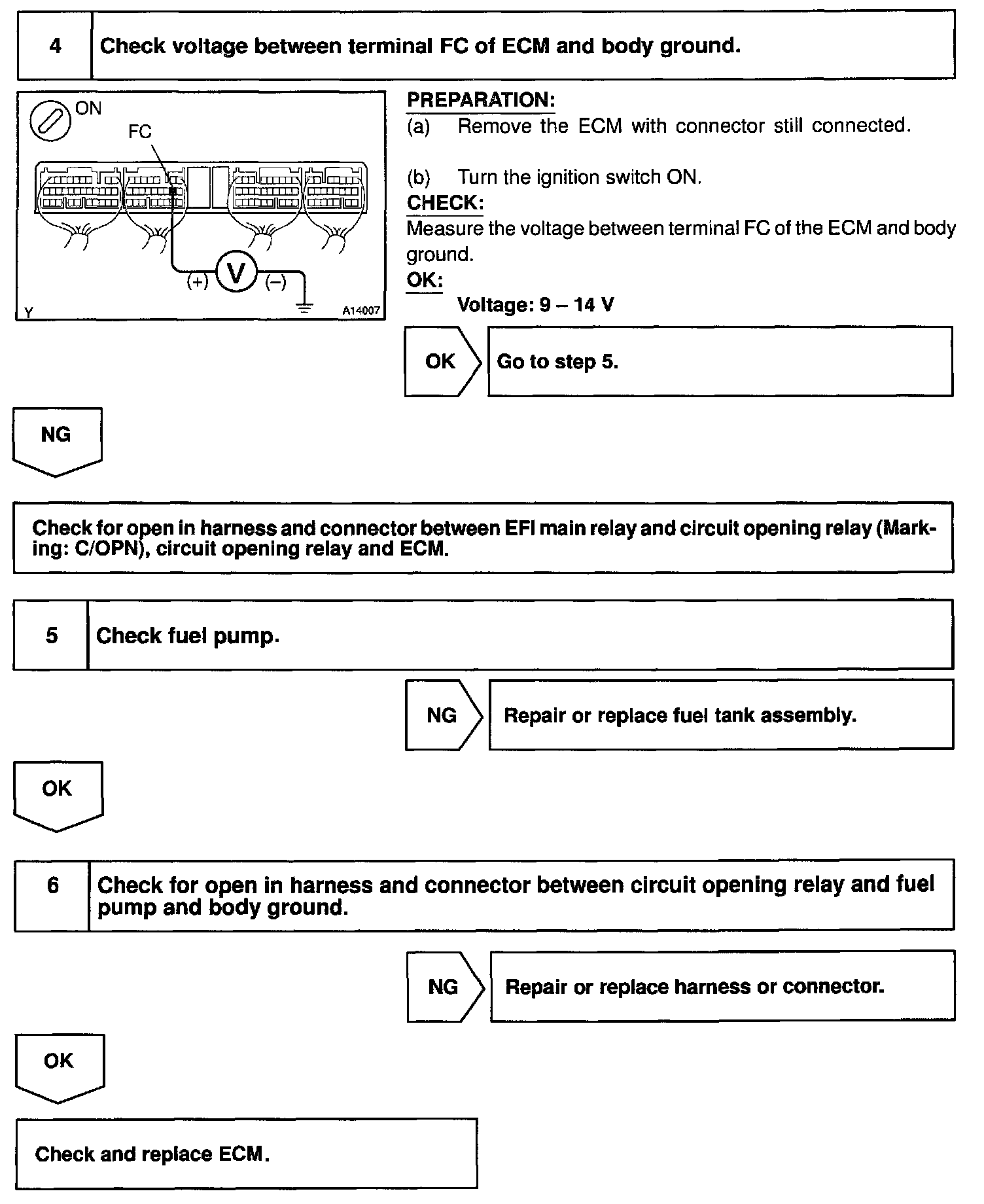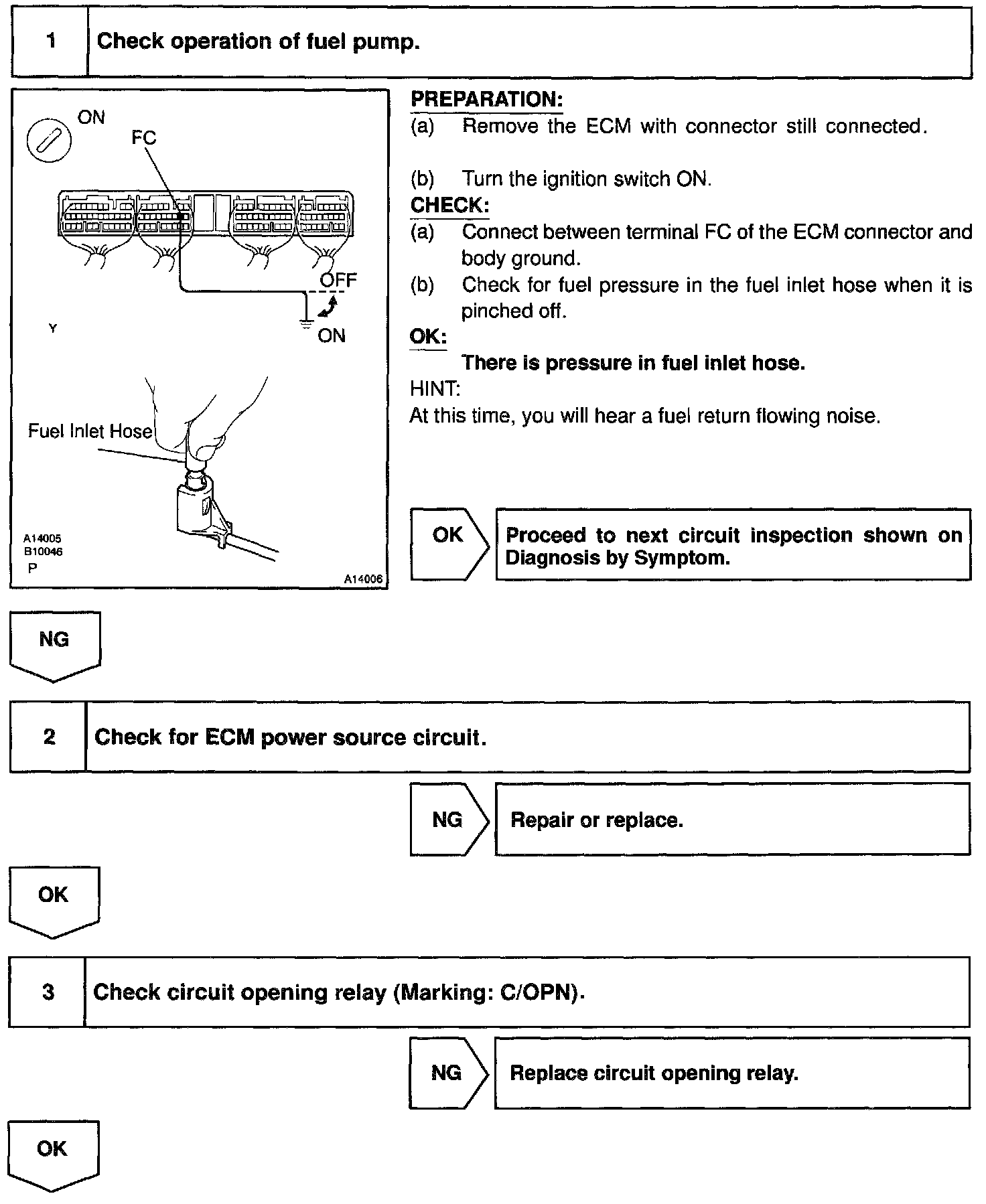 With the cranking by MG1, NE signal comes in immediately, so the engine ECU receives the generation of NE signal and turns the fuel pump. (At this time, no reference of the communication from HV ECU) When stopping the fuel pump: