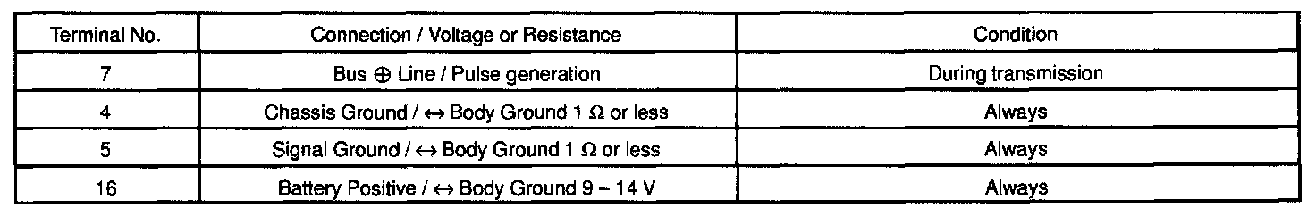 NOTE: The values given below for "Normal Condition" are representative values, so a vehicle may still be normal even if its value varies from those listed here. So do not decide whether a part is faulty or not solely according to the "Normal Condition" here.