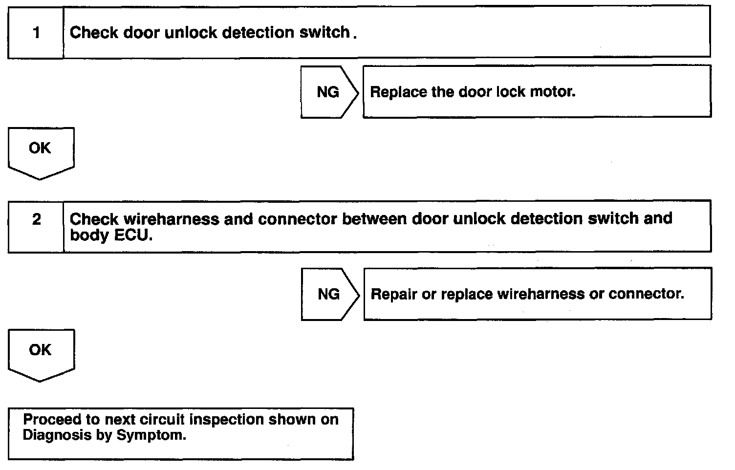 CIRCUIT DESCRIPTIONThe door unlock detection switch is built in the door lock motor assembly. This switch is ON when the door lock knob is in the unlock position and OFF when the lock knob is in the lock position. The ECU detects the door lock knob conditions is this circuit. It is used as one of the operating conditions for the key confinement prevention function.