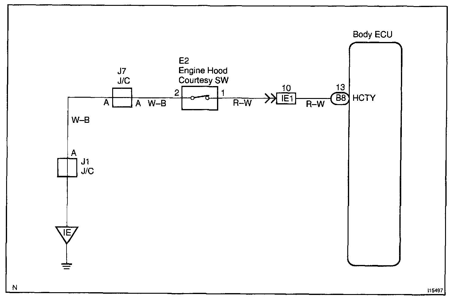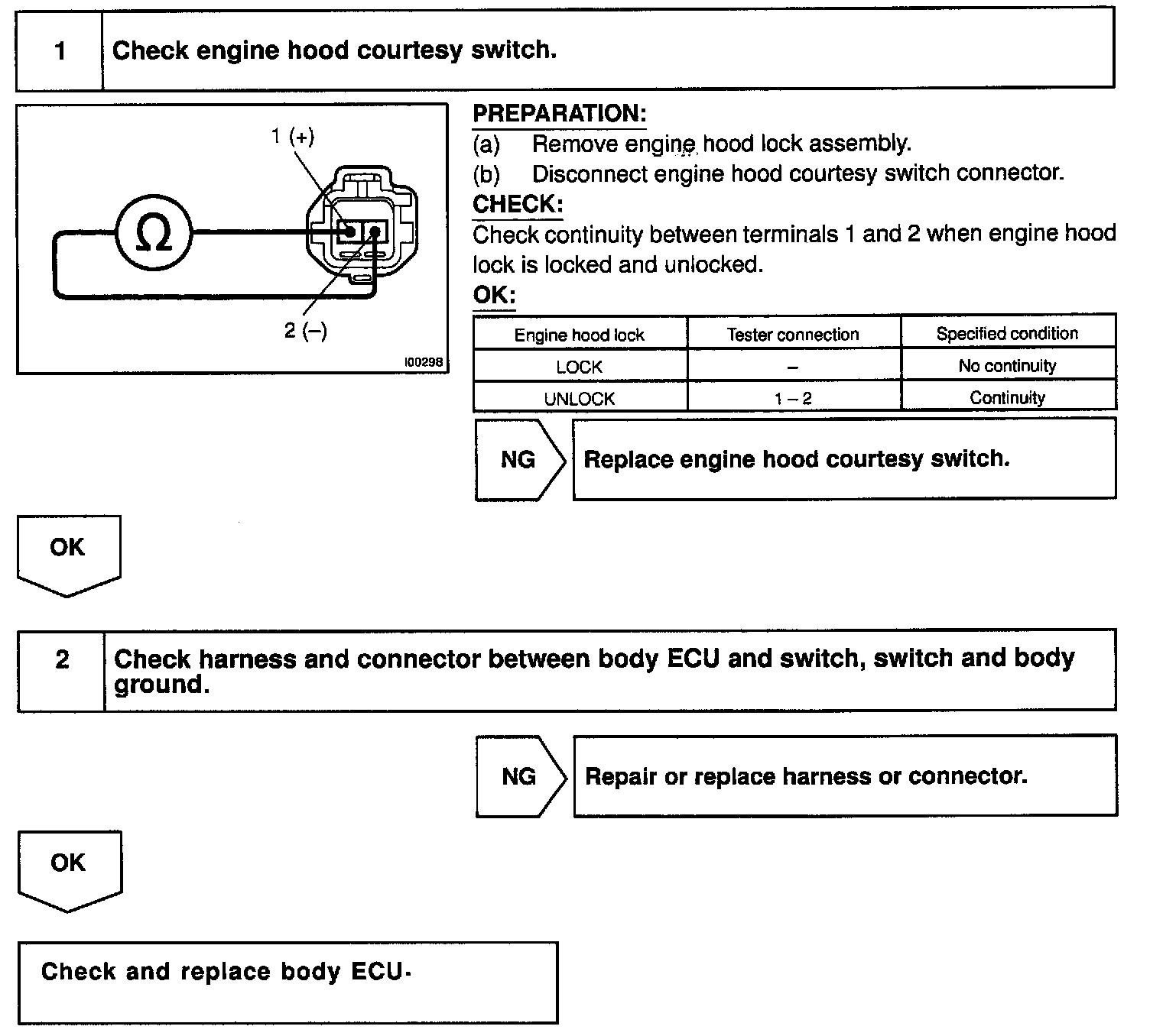CIRCUIT DESCRIPTIONThe engine hood courtesy switch is built into the engine hood lock assembly and goes ON when the engine hood is opened and goes OFF when the engine hood is closed.