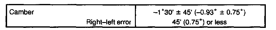 If the measured value is not within the specified value, inspect the suspension parts for damage and/or wear and replace them if necessary because camber is not adjustable.