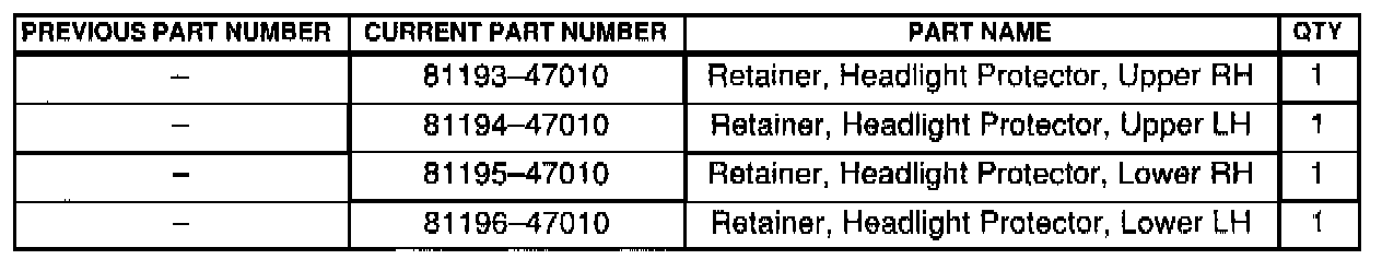 To improve serviceability on the 2001 model year Prius, the headlight protector retainers have been established as separate service parts. If a headlight retainer is damaged, the headlight can be reused by installing the appropriate retainer. Please use the procedures described in this bulletin to repair the affected headlight retainer.