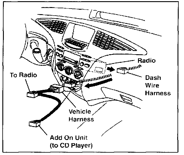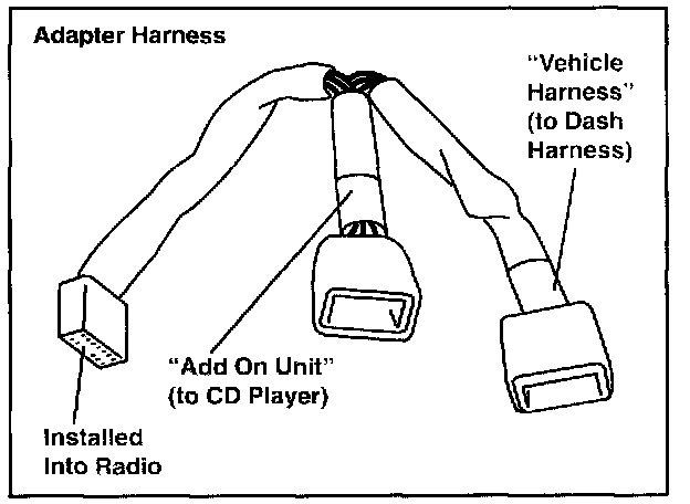 5. Attach the connector with the tag "Add On Unit" to the CD player. Attach the connector with the tag "Vehicle Harness" to the dash harness.