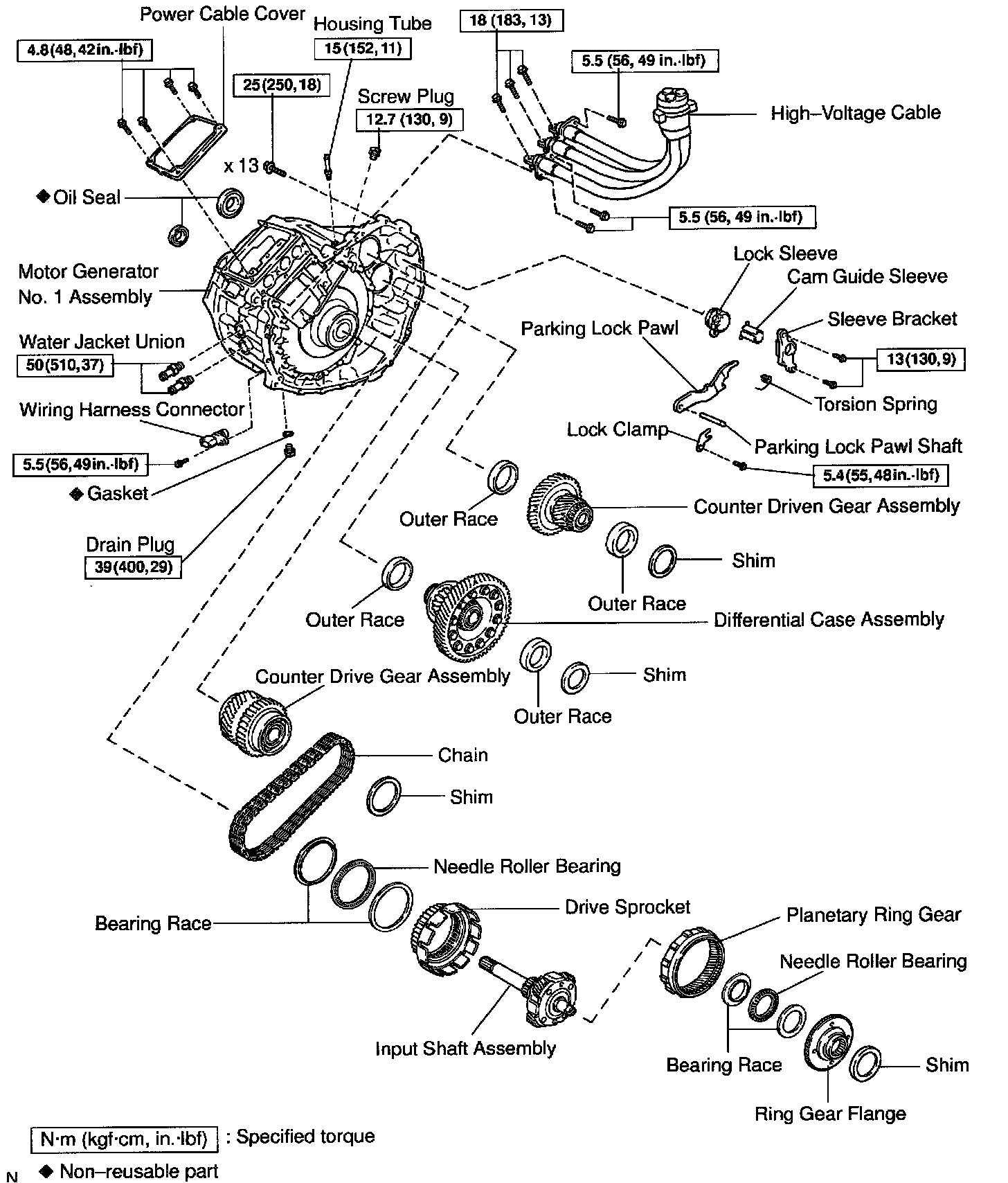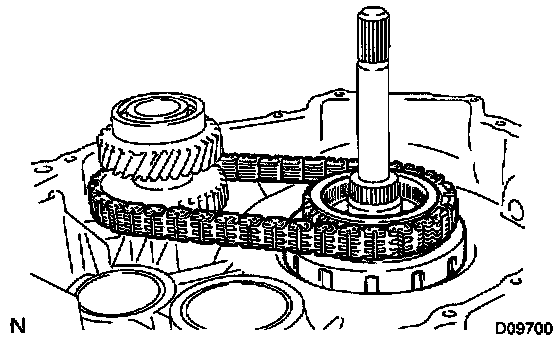 HINT: When separating the MG1 assembly from the MG2 assembly, to prevent the drive sprocket from being removed with the MG1 assembly, push down the chain part with a taped screwdriver tip.