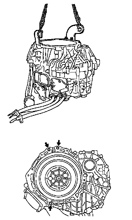 Install the engine hanger onto the MG1 side as shown in the illustration, and lift it up by a chain device.
