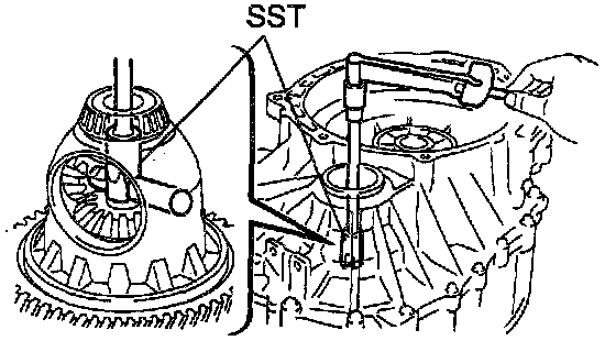 Using SST and a hammer, install the outer race of differential side bearing LH and shim.