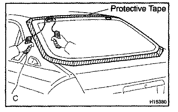 b. Hold the back window glass in place securely with a protective tape or equivalent until the adhesive hardens.